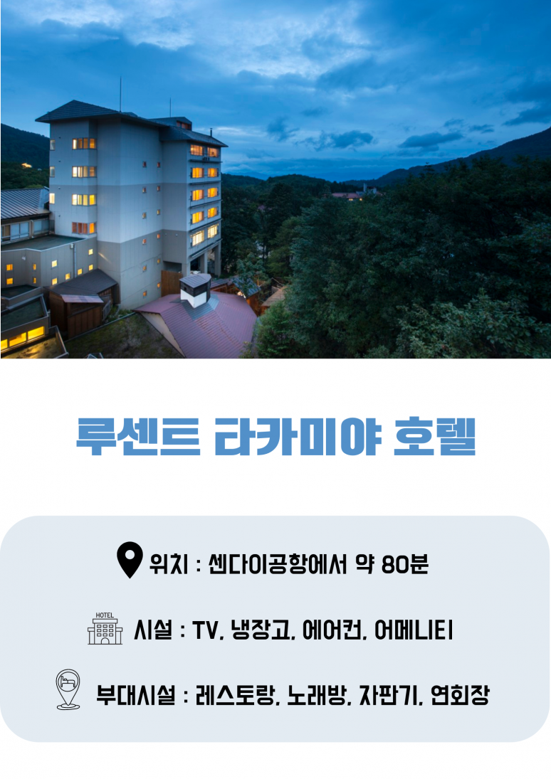 호텔 조식 후 체크아웃 센다이 공항 이동 (약 70분) 센다이 국제공항 출발 인천 국제공항 도착 |