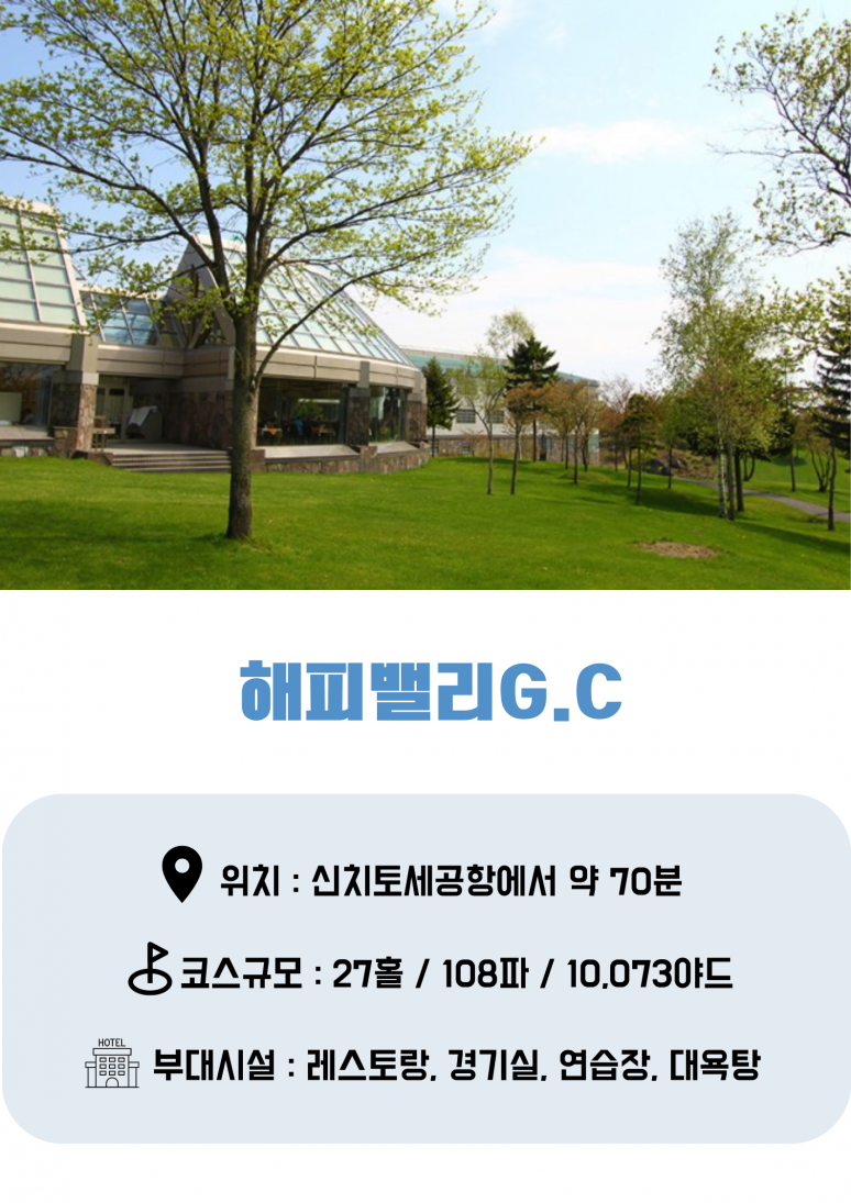 인천 국제 공항 출발 신치토세 국제공항 도착 기사 미팅 후 호텔로 이동 (약 70분) ▶ 해피밸리CC 18홀 (셀프+카트 라운드) 호텔 체크인 후 석식 및 휴식 |