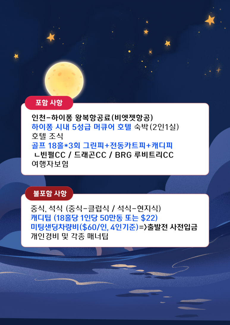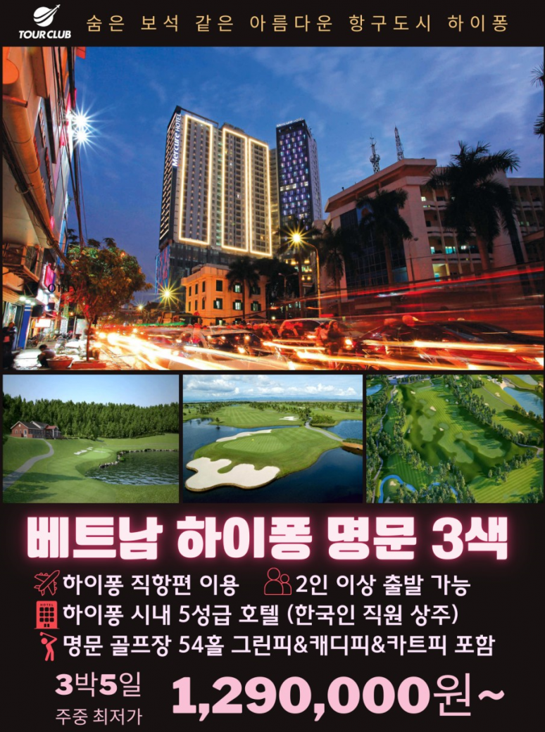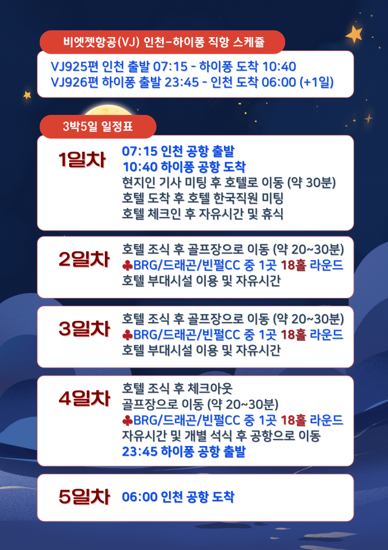 | 하이퐁 | 호텔 조식 후 골프장 이동 빈펄 하이퐁CC 18 홀 라운딩 라운딩후 호텔의 부대시설 이용 및 자유시간 석식 후 공항으로 이동 |