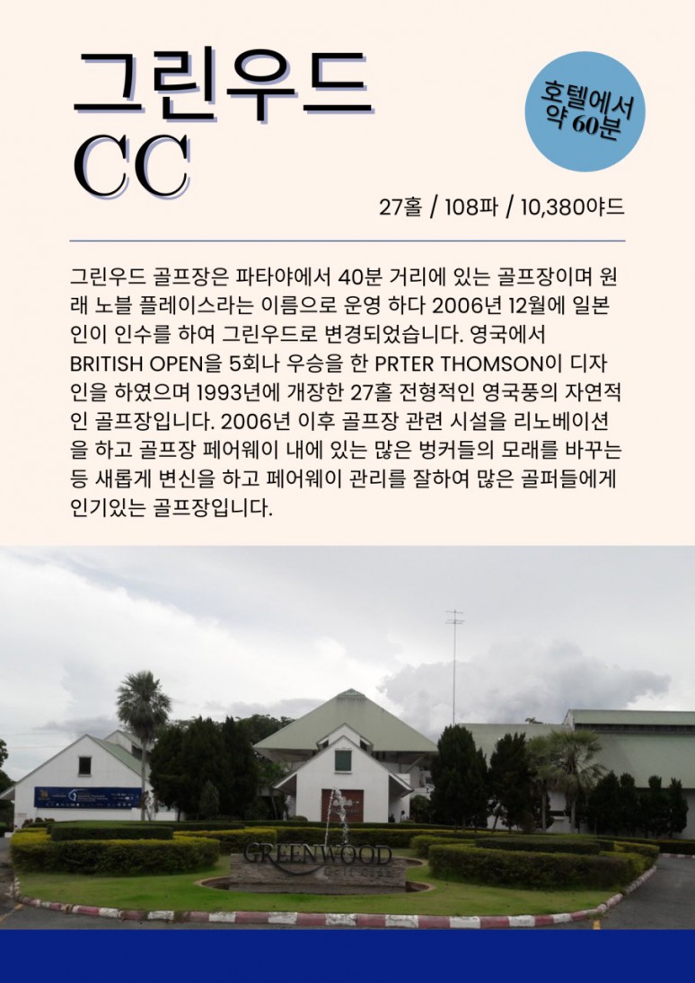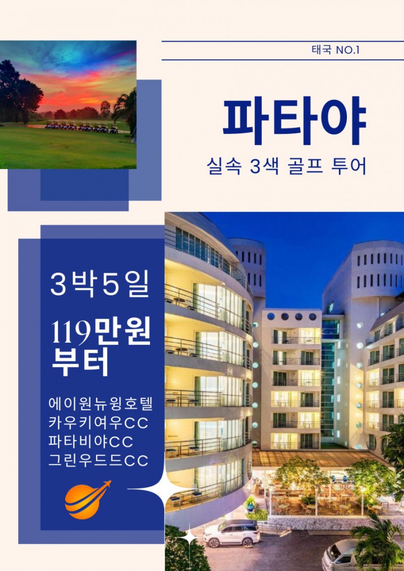 | 파타야 | 전일 | 호텔 조식 후, 골프장으로 이동 파타비아아 CC .그린우드CC.실키오크CC 中 18홀 라운딩 자유일정 및 석식 후, 호텔 투숙 및 휴식 |