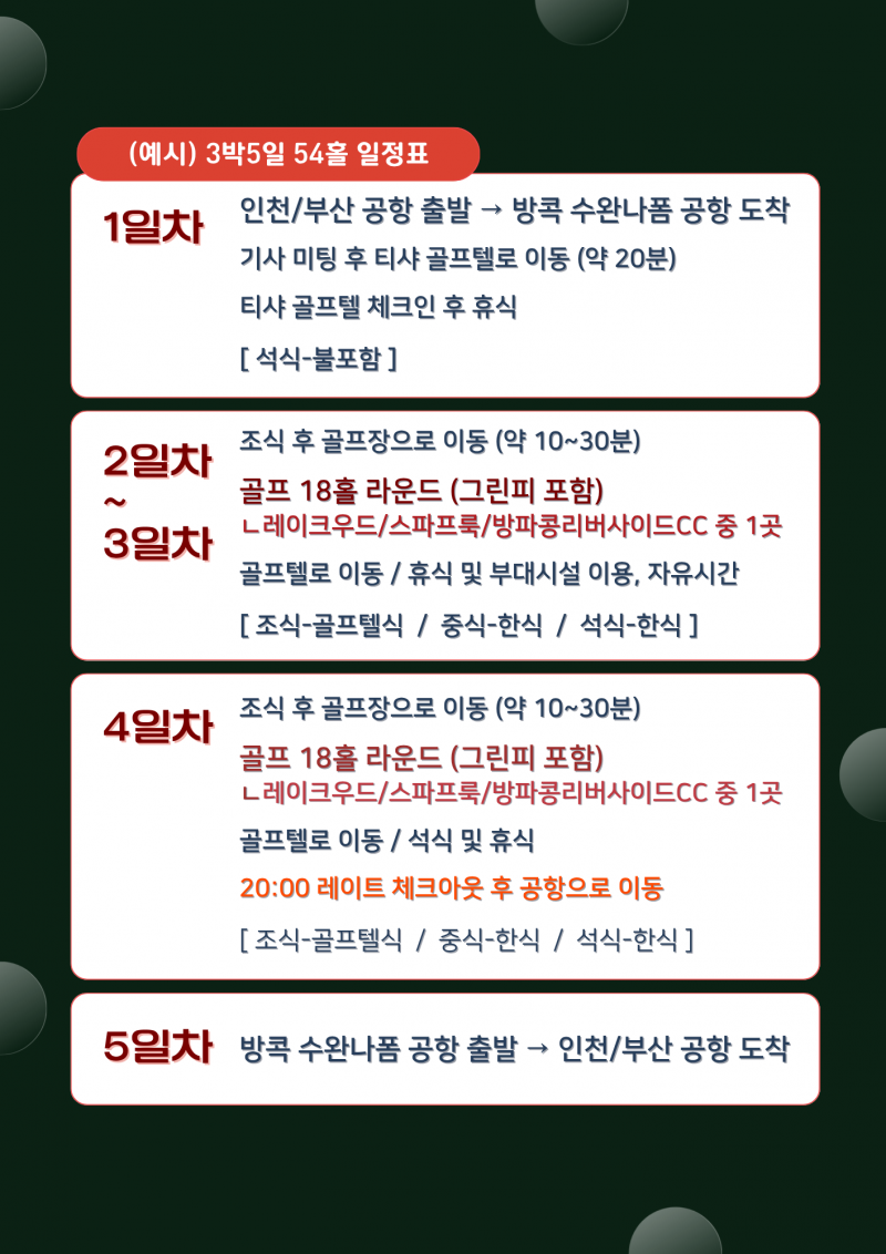 조식 후 골프장 이동 (도보 5분) 파인허스트 18홀 라운딩 호텔 체크아웃 및 공항으로 이동 방콕 수완나품공항 출발 인천 국제공항 도착 |